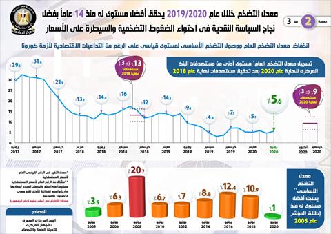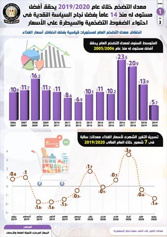 أصدر المركز الإعلامي لمجلس الوزراء تقريراً تضمن "إنفوجرافاً" سلط فيه الضوء على تحقيق معدل التضخم أفضل مستوى له خلال عام 2019 / 2020 منذ 14 عاماً (2005 / 2006) بعد انخفاضه لمستويات قياسية بفضل انخفاض أسعار الغذاء.