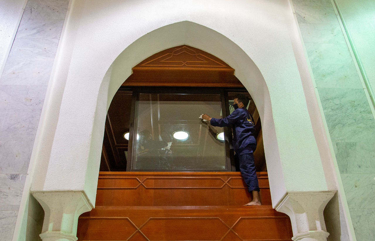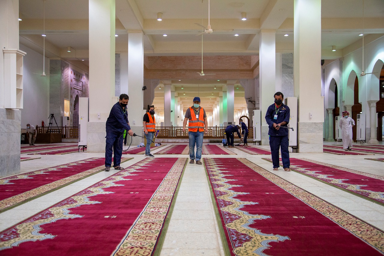 كما أسندت المسجد لشركة متخصصة في مجال التعقيم والنظافة تعمل على مدار الساعة منذ بداية شهر ذي الحجة، إلى جانب تحديد مسارات للدخول والخروج وتقسيم المسجد لتفويج الحجاج وتنظيم حركتهم وتحديد مواقع جلوسهم للصلاة، مع مراعاة تحقيق التباعد بمسافة مترين بين كل حاج وآخر من خلال وضع ملصقات تحدد مواضع الصلاة.