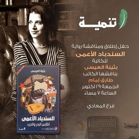 تستضيف مكتبة تنمية، الكاتبة الكويتية بثينة العيسى، في حفل توقيع ومناقشة رواية "السندباد الأعمى"، أحدث أعمالها الإبداعية، وذلك يوم الجمعة المقبل الموافق 29 أكتوبر، في تمام الساعة 7 مساء بمقر المكتبة في 49 المركز الرئيسي، المعراج، شارع الأرقم بن أبي الأرقم، خلف كارفور المعادي، بجوار مدرسة الليسيه.