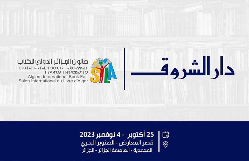 تشارك دار الشروق في وقائع وفعاليات صالون الجزائر الدولي للكتاب في نسخته للعام 2023، وذلك عبر جناح متكامل للدار يحمل رقم D30 بالقاعة الرئيسية، يتضمن أحدث الإصدارات من الكتب الفكرية والروايات الأدبية، وأحدث إصدارات كتب الأطفال واليافعين.