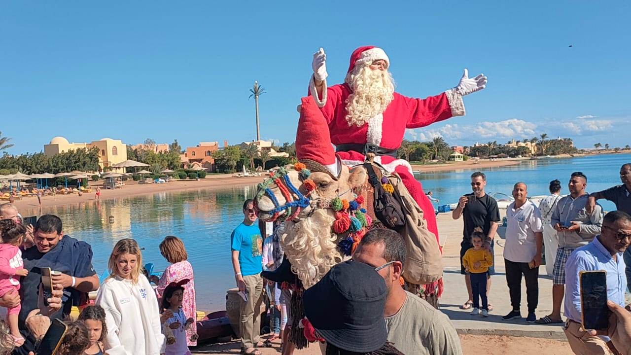 من بلجيكا إلى الغردقة.. بابا نويل يوزع الهدايا على الأطفال راكبا على جمل