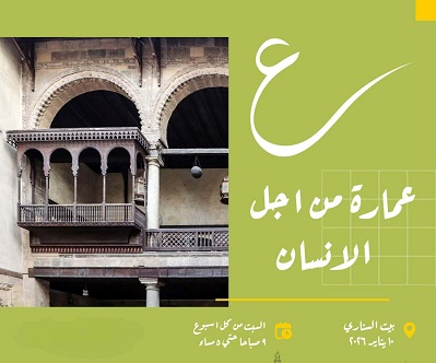 يستضيف بيت السناري الأثري في حي السيدة زينب بمحافظة القاهرة، ورشة عمل متخصصة بعنوان "ع" عمارة من أجل الإنسان، وذلك ابتداءً من يوم السبت الموافق 10 يناير 2026، وحتى السبت 14 فبراير 2026.