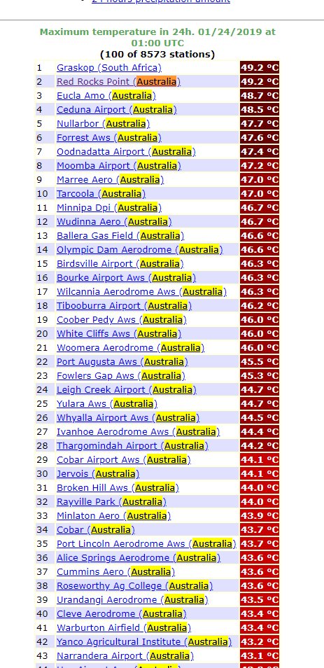 وتجتاح البلاد، موجة حر بلغت ذروتها في ولاية أستراليا الجنوبية، منذ أمس، بعدما تجاوزت درجة الحرارة في عاصمتها 47,7 درجة مئوية، بحسب الجارديان، تشهدت أستراليا موجة حر شديدة، منذ الأسبوعين الماضيين، سجلت على إثرها 5 أيام ضمن أشد 10 أيام في تاريخها، وصلت أديلايد إلى 46.6 درجة مئوية، ومن المرتقب أن تمتد هذه الموجة على مدن أستراليا الأسبوع الجاري بحسب جريدة الإندبندت.