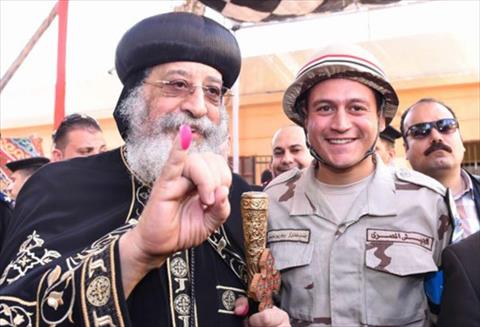 ومازح البابا تواضروس، خلال تلك الفترة الجميع، قائلا: «ابقوا اكتبوا اسمي اللي فالبطاقة علطول»، وعقب خروجه من اللجنة والإدلاء بصوته استقبله النائب محمد أبو حامد، عضو مجلس النواب، على الرغم من أن لجنته الانتخابية خارج تلك الدائرة، إلا أنه أكد أن حضوره مع البابا تضامني هدفه عرض صورة الوحدة الوطنية، وأن المصريين جميعا مسلمين ومسيحين يد واحدة ضد الإرهاب.