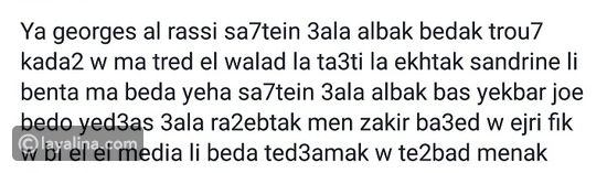 "يا جورج الراسي صحتين على قلبك، بدك تروح قضاء وما ترد الولد وتعطي لاختك سندرين، يللي بنتها ما بدا اياها، صحتين على قلبك، وبس يكبر جو بدو يدعس على رقبتك، ومن ذكر بعضنا واجري فيك وبالمديا يللي بدها تدعمك وتقبض منك".