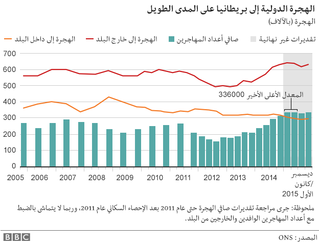 وحسب أرقام مكتب الإحصاء التي يبينها الجدول التالي: توجد زيادة في الهجرة إلى بريطانيا قدرت ب20 ألف مهاجر جديد، حيث قفز العدد من 313 ألف عام في ديسمبر 2014 إلى 330 ألف نهاية 2015.
