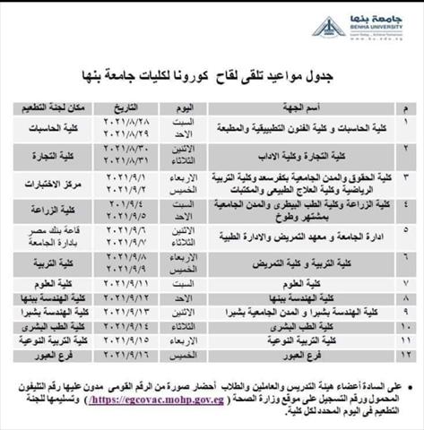 أعلنت جامعة بنها، بدء مواعيد تلقي لقاح كورونا لأعضاء هيئة التدريس والعاملين والطلاب داخل الكليات، وتخصيص مكان محدد لكل كلية داخل الجامعة.