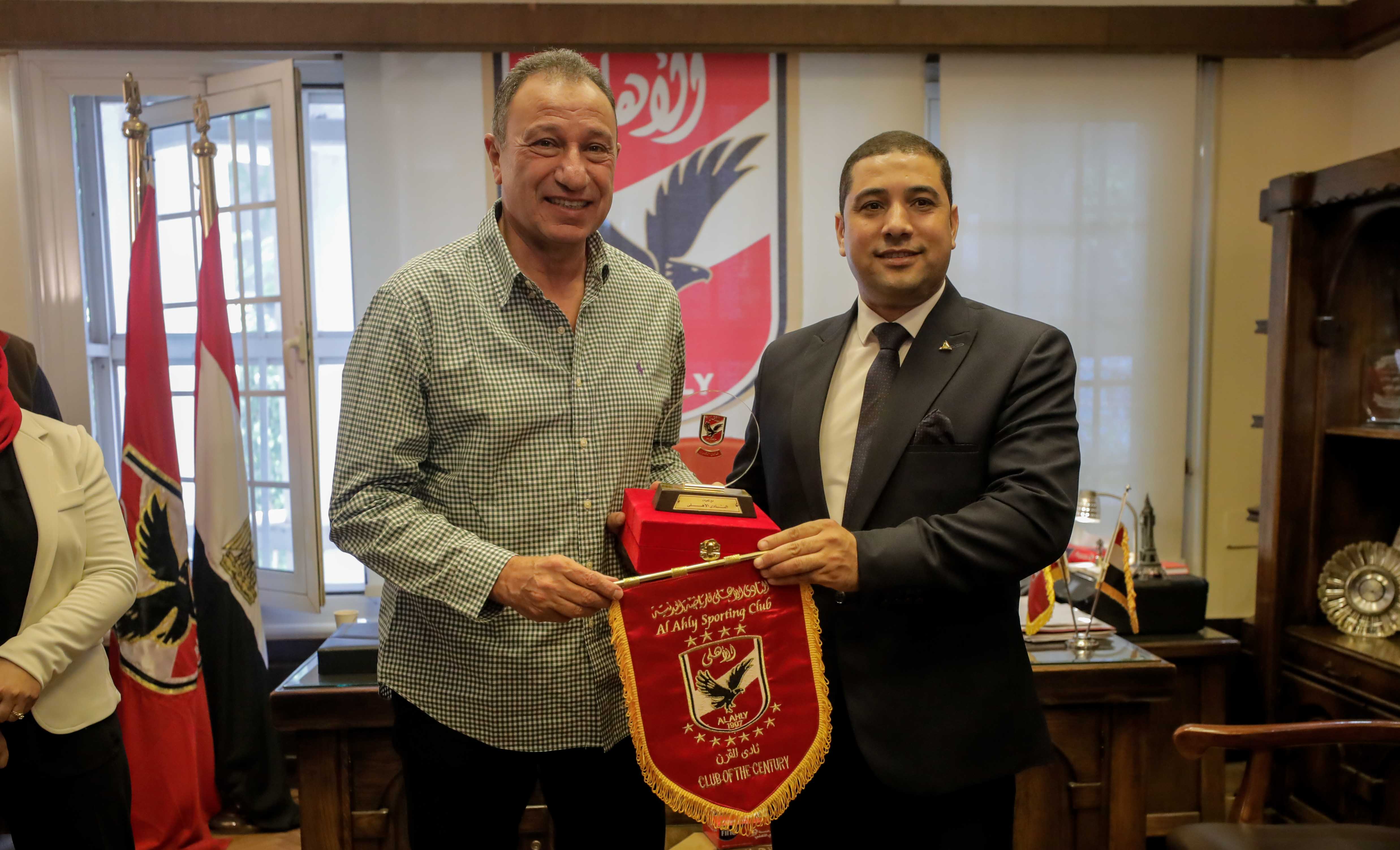 أهدي محمود الخطيب، رئيس النادي الأهلي درع وعلم الأهلي لوفد الهيئة العامة لتعليم الكبار برئاسة الدكتور عاشور أحمد عمري والذي قام بزيارة مقر النادي بالجزيرة ظهر اليوم؛ لتوقيع بروتوكول تعاون مشترك لاستكمال تعليم 240عاملا داخل النادي بمختلف فروعه.