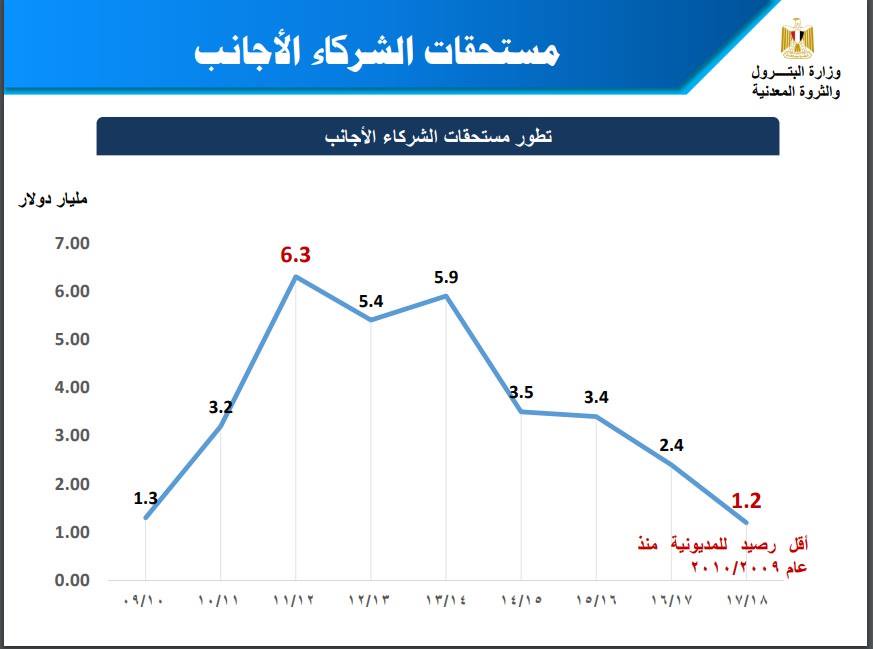 نجحت وزارة البترول، في خفض مستحقات الشركاء الأجانب المتأخرة في البحث عن البترول والغاز إلى 1.2 مليار دولار، وهو مستوى غير مسبوق، متوقعة أن تنتهي من سداد المستحقات بالكامل في نهاية عام 2019.