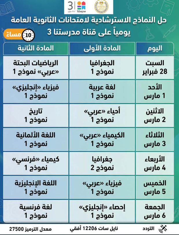 وأشارت الوزارة إلى أنه سيتم اتاحة نموذج استرشادي لكل مادة بالتتابع على موقع الوزارة يوميا في تمام الساعة ٩ مساء وفقا للجداول المعلنة والتي تمتد حتى شهر مايو المقبل بالتوازي مع إتاحة حل النماذج عبر قناة "مدرستا ٣" عبر سلسلة من الحلقات التي سيتم إذاعتها يوميا في تمام الساعة العاشرة مساء على أن تكون الإعادة في تمام الساعة ١٢ ظهر اليوم التالي.