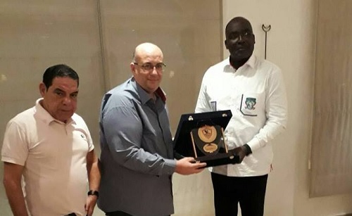 كرم رحاب أبو رجيلة عضو مجلس إدارة نادى الزمالك للعبة منصور أريمو رئيس الاتحاد الإفريقي لكرة اليد، ورئيس نادى الحمامات التونسى المستضيف للبطولة الأفريقية، المقامة في تونس.