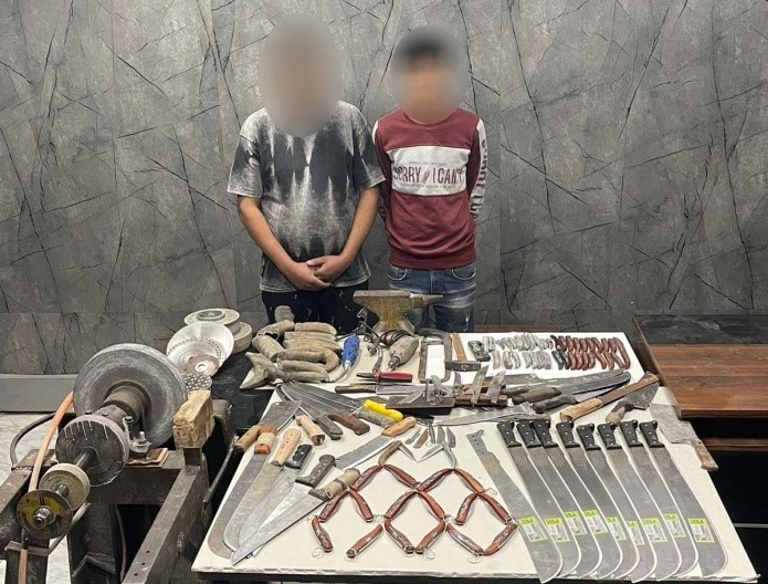 عقب تقنين الإجراءات تم ضبطهما وعثر بداخل الورشة على (69 قطعة سلاح أبيض، الأدوات المستخدمة فـى التصنيع).