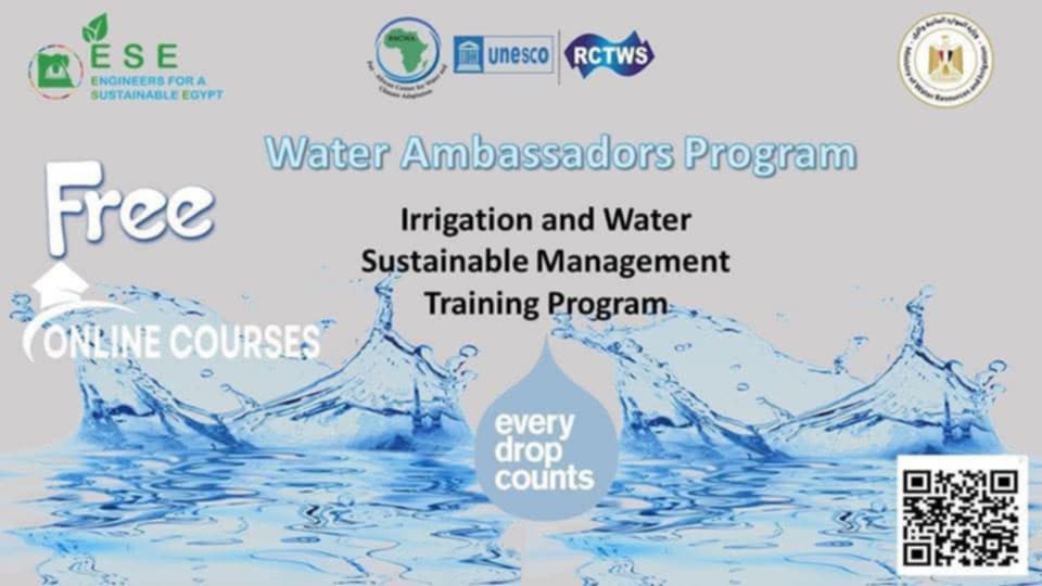 يعلن مركز التدريب الإقليمي للموارد المائية والري، عن فتح باب التسجيل للدفعة الثانية من البرنامج التوعوي الأكبر والمجاني "سفراء المياه" والذي ينظمه مركز التدريب الإقليمي للموارد المائية والري، بالتعاون مع مؤسسة "مهندسون من أجل مصر المستدامة" في إطار مذكرة التفاهم المْوقعة بتاريخ 8 مايو 2024 بين الجانبين.