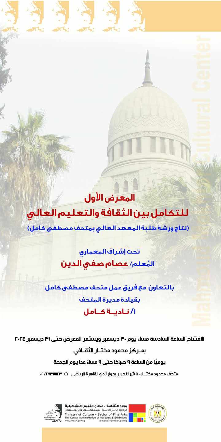 يفتتح الدكتور وليد قانوش رئيس قطاع الفنون التشكيلية، المعرض الأول "للتكامل بين الثقافة والتعليم العالي"، نتاج ورشة طلبة المعهد العالي بمتحف مصطفى كامل، وذلك برعاية الدكتور أحمد فؤاد هنو وزير الثقافة، وذلك يوم الإثنين المقبل، في الساعة السادسة مساء، بمركز محمود مختار الثقافي.