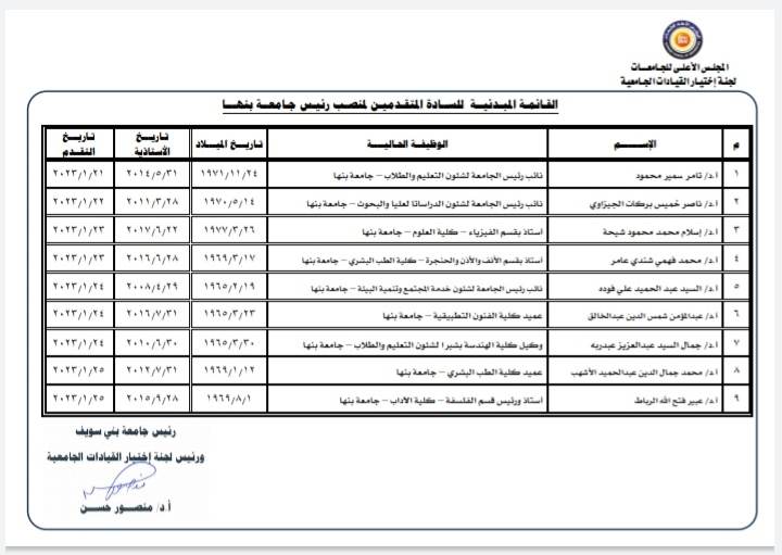 وترشح على منصب رئيس جامعة بنها الدكتور الدكتور تامر سمير نائب رئيس الجامعة لشئون التعليم والطلاب، والدكتور ناصر الجيزاوي، نائب رئيس الجامعة لشئون الدراسات العليا، والدكتور إسلام شيحة، عميد كلية العلوم، والدكتور محمد فهمي الأستاذ بكلية الطب، الدكتور السيد عبدالحميد، نائب رئيس الجامعة لشئون خدمة المجتمع وتنمية البيئة، والدكتور عبدالمؤمن شمس الدين، عميد كلية الفنون التطبيقية، والدكتور جمال السيد وكيل كلية الهندسة بشبرا، والدكتور محمد الأشهب عميد كلية الطب البشري، والدكتورة عبير الرباط أستاذ بكلية الآداب، وذلك خلفا للدكتور جمال سوسة.