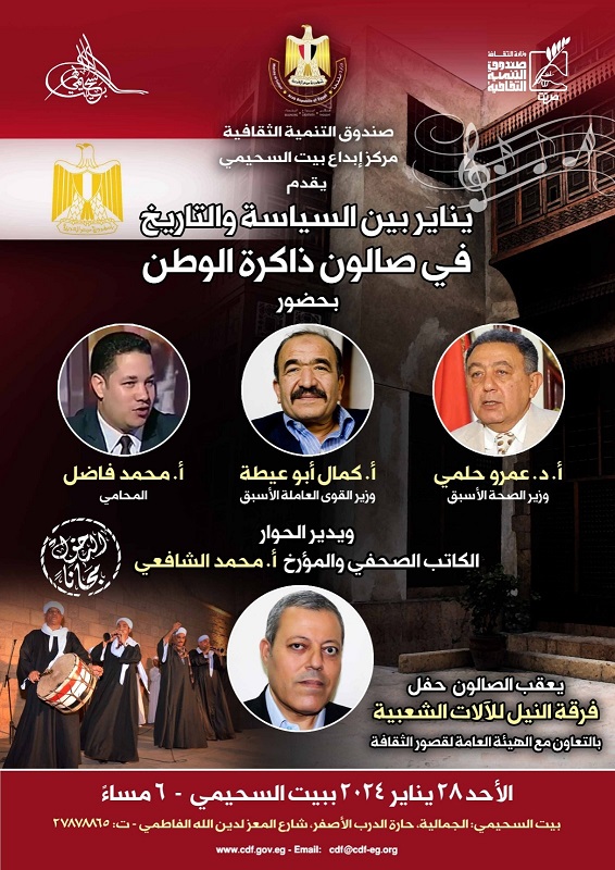 يقام صالون هذا الشهر تحت عنوان "يناير بين السياسة والتاريخ"، تحت رعاية الدكتورة نيفين الكيلاني وزيرة الثقافة، ويدير الحوار الكاتب الصحفي والمؤرخ محمد الشافعي، ويستضيف فيه الدكتور عمرو حلمي، وزير الصحة الأسبق، وكمال أبو عيطة، وزير القوى العاملة الأسبق، ومحمد فاضل المحامي.