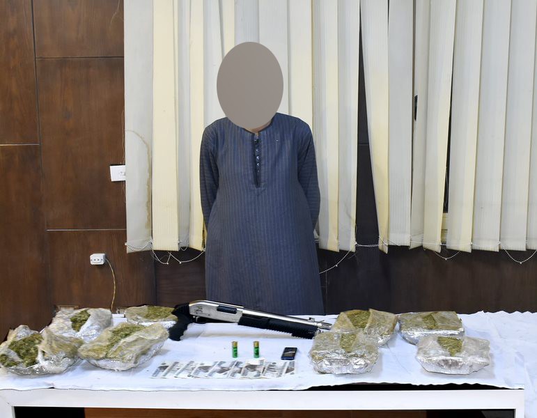 وبتقنين الإجراءات تم استهداف المتهم وضبطه وبحوزته (كمية من مخدر الهيدرو وزنت 5 كيلوات، بندقية خرطوش، ومبلغ مالي، وهاتف محمول).