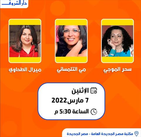 تنظم مكتبة مصر الجديدة العامة، ندوة "حكاية الرواية الأولى"، يوم 7 مارس المقبل، في تمام الساعة 5:30 مساء، تتحدث فيها كاتبات دار الشروق: سحر الموجي عن رواية "دارية"، ومي التلمساني عن رواية "دنيا زاد"، وميرال الطحاوي عن رواية "الخباء"، بمشاركة الروائي منتصر القفاش، ويدير الندوة الفنان عمرو عادل.
