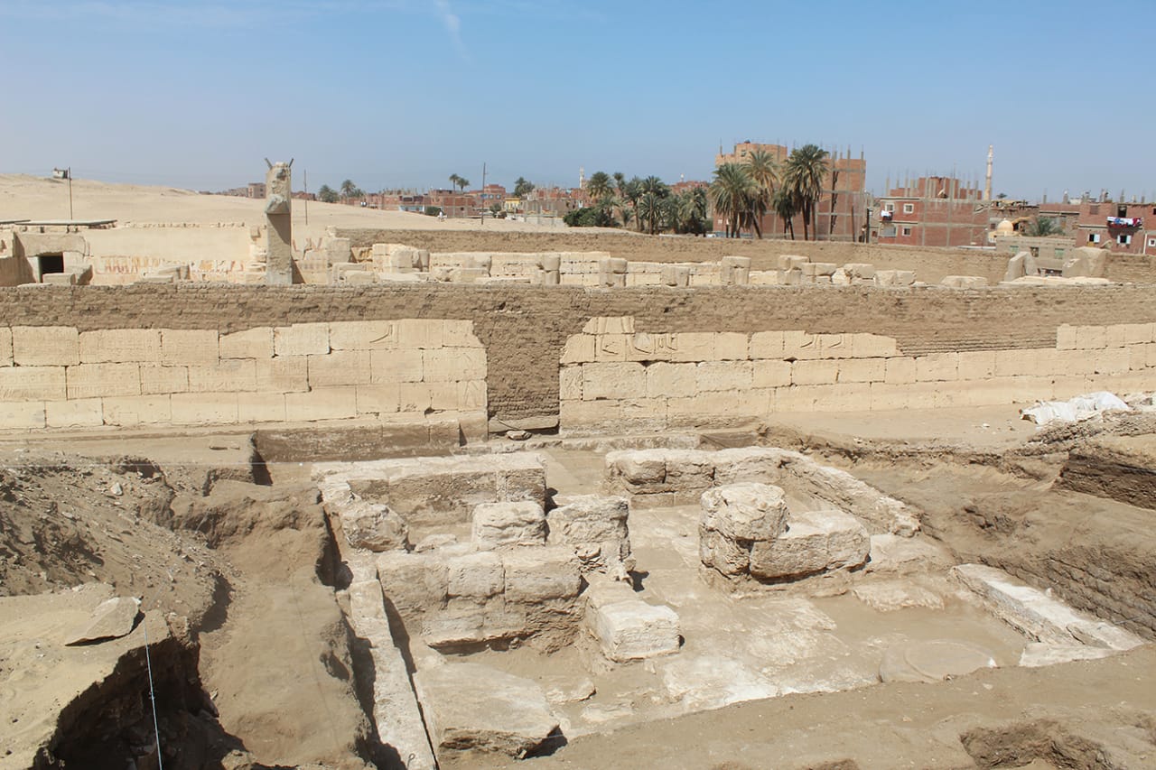 وقال الدكتور سامح إسكندر رئيس البعثة الأثرية، إنه أثناء أعمال الحفائر في الناحية الجنوبية من المعبد تم العثور على ممشى حجري أمام الباب الجنوبي الغربي للمعبد والذي تبين أنه يقود إلى مدخل مبنى يظهر لأول مرة وتحمل جدرانه بقايا نقش خرطوش رمسيس الثاني.