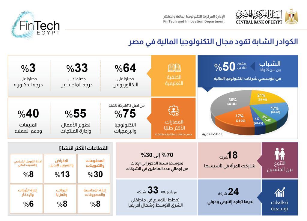 أوضح تقرير منظور التكنولوجيا المالية في مصر 2021 - الصادر مؤخرًا عن مبادرة"فينتك إيجيبت" التابعة للبنك المركزي المصري – أن أعمار مؤسسي الشركات العاملة في مجال التكنولوجيا المالية تتراوح ما بين 25 إلى 35 عامًا (يمثلون نسبة أكثر من 50%)، وأن 64% من رواد الأعمال قد حصلوا على درجة البكالوريوس، بينما حصل نحو 33% منهم على درجة الماجستير، و3% فقط هم الحاصلين على درجة الدكتوراه.
