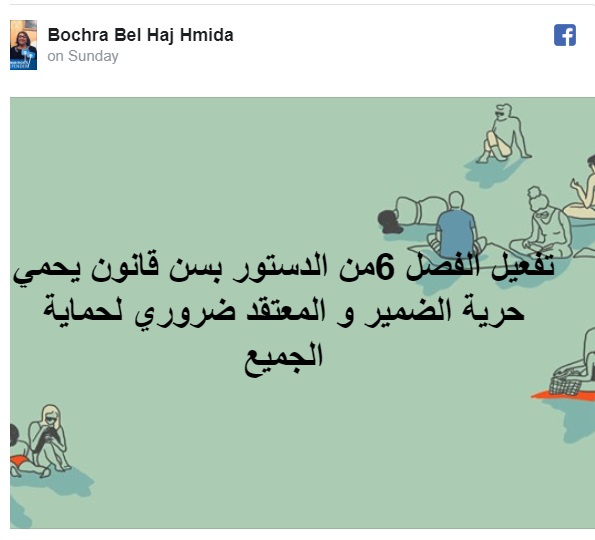 وكتبت حميدة عبر حسابها على موقع التواصل الاجتماعي "فيسبوك"، "تفعيل الفصل 6 من الدستور بسن قانون يحمي حرية الضمير والمعتقد ضروري لحماية الجميع".