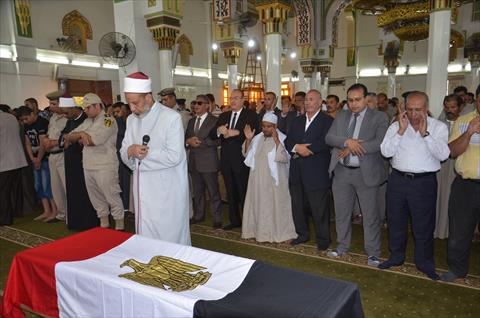 وأدى المحافظ، ومدير الأمن، صلاة الجنازة على جثمان الشهيد بمسجد عمر بن عبدالعزيز بمدينة بني سويف، بحضور محمود مغربي، رئيس المدينة، والشيخ محمد أبوحطب، وكيل وزارة الأوقاف، والمستشار أحمد عبدالجواد، رئيس مجلس إدارة مسجد عمربن عبدالعزيز، والشيخ أحمد عبدالعال، إمام وخطيب المسجد، والعديد من قيادات المحافظة العسكرية والأمنية والتنفيذية، حيث أقيمت جنازة عسكرية وشعبية للشهيد انطلقت من أمام المسجد، وسط هتافات منددة بالإرهاب.