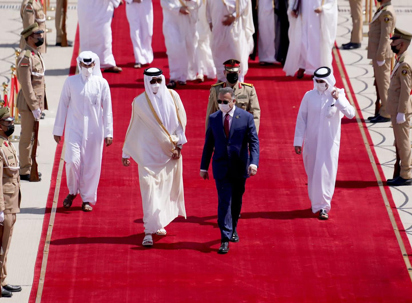 وكان في مقدمة مستقبلي أمير قطر، رئيس الحكومة العراقية مصطفى الكاظمي وعدد من الوزراء وكبار المسؤولين والمستشارين العراقيين.