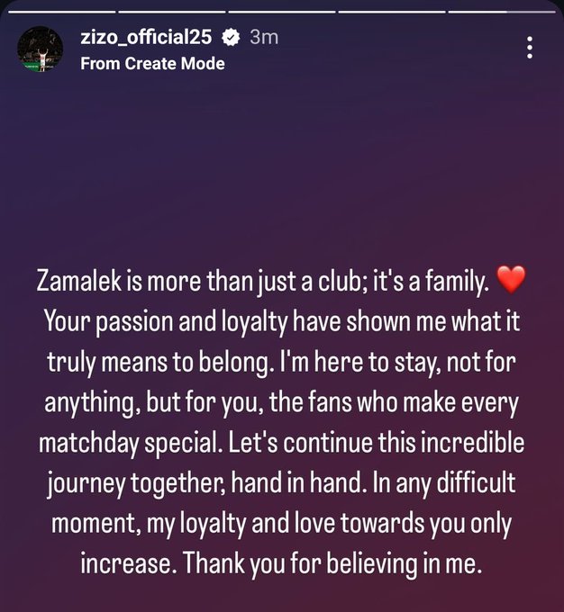 وكتب زيزو عبر حسابه الشخصي على منصة «إنستجرام»: «الزمالك أكثر من مجرد نادي، الزمالك عائلة كبيرة، شغف جمهور الزمالك وولائه أظهر لي معني الإنتماء حقا.