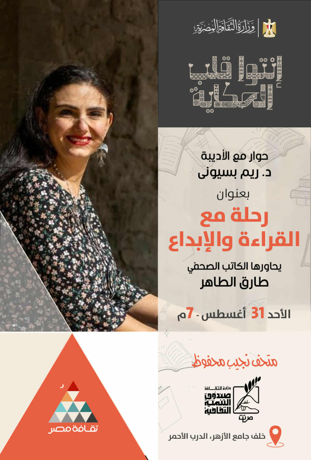 ينظم صندوق التنمية الثقافية يوم الأحد المقبل لقاء مفتوح مع الكاتبة والروائية الدكتورة ريم بسيوني يتضمن مناقشة روايتها الأولى "رائحة البحر"، تحت عنوان "رحلة مع القراءة والإبداع"، في الساعة السابعة مساء، وذلك ضمن مبادرة "إنتوا قلب الحكاية"، ويدير اللقاء ويقدمه الكاتب طارق الطاهر، مدير متحف نجيب محفوظ.