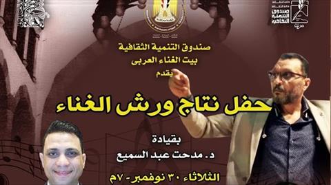 يقيم بيت الغناء العربي "قصر الأمير بشتاك" التابع لقطاع صندوق التنمية الثقافية، حفلا في السابعة مساء بعد غد الثلاثاء؛ لعرض نتاج ورش الغناء التدريبية التي أقيمت بيت الغناء العربي على مدار ثلاث أشهر تحت أشراف الفنان مصطفى النجدي والدكتور مدحت عبد السميع.