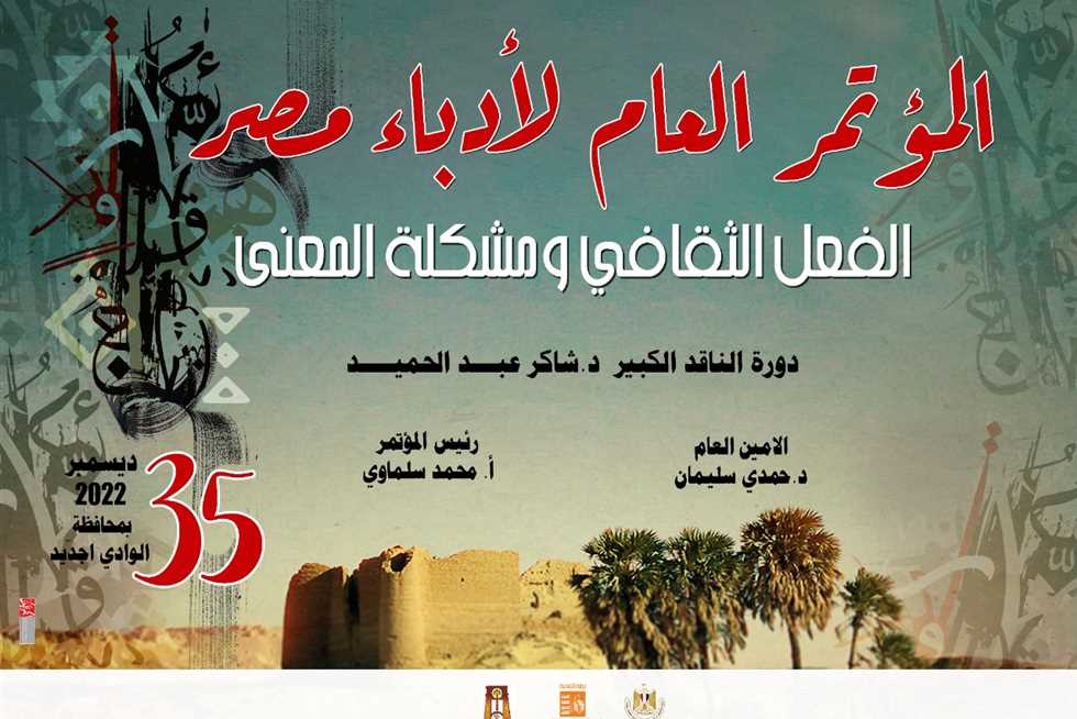 ينطلق مؤتمر أدباء مصر في دورته الخامسة والثلاثين، غدا الخميس، وذلك لأول مرة بمحافظة الوادي الجديد، وتستمر فعالياته لمدة 4 أيام على مسرح سينما هيبس بالخارجة، ومكتبة مصر العامة والمركز الاستكشافي وقصر ثقافة الخارجة، بجانب فعاليات في مركز الداخلة وبعض بيوت الثقافة في القرى، بحضور الدكتورة نيفين الكيلاني وزيرة الثقافة، واللواء محمد الزملوط محافظ الوادي الجديد، ونحو 350 أديبا من أندية الأدب والإعلاميين والنقاد والشخصيات العامة، بجانب إعلان الوادي الجديد عاصمة الثقافة المصرية عام 2023.