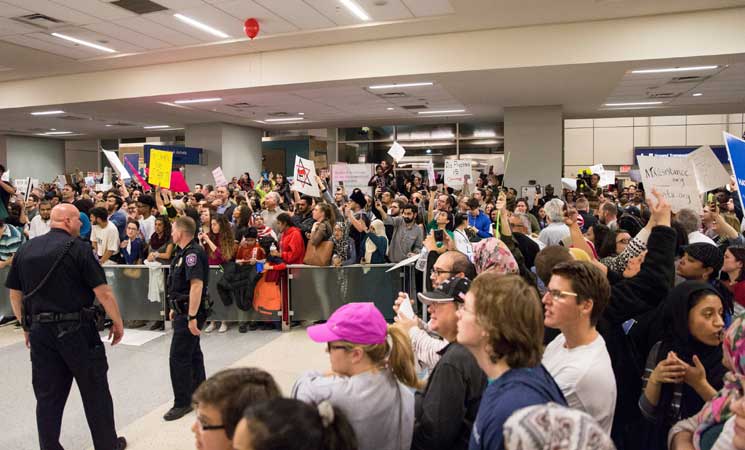 وبالإضافة إلى المسار القضائي الذي سلكته هذه الجمعيات الحقوقية للطعن بقرار «ترامب»، فقد شهدت مطارات عديدة في أنحاء البلاد تظاهرات احتجاجية طالب خلالها المتظاهرون بإطلاق سراح الموقوفين وغالبيتهم ممن لديهم تأشيرات صالحة أو يحملون حتى البطاقة الخضراء، تصريح الإقامة الدائمة في الولايات المتحدة، ومع ذلك لم يسمح لهم بدخول البلاد واعتقلوا في المطارات.