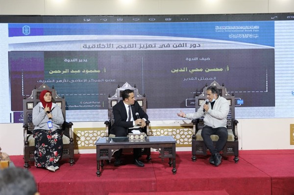 عقد جناح مجلس حكماء المسلمين بمعرض القاهرة الدولي للكتاب، رابع ندواته الثقافية تحت عنوان: "خطوة نحو تعزيز الإخاء الإنساني"، بمشاركة أ. د. نهلة الصعيدي مستشار شيخ الأزهر لشؤون الوافدين، ورئيس مركز تطوير وتعليم الطلاب الوافدين والأجانب بالأزهر، تناولت طرق تعزيز التعايش المشترك والإخاء الإنساني.