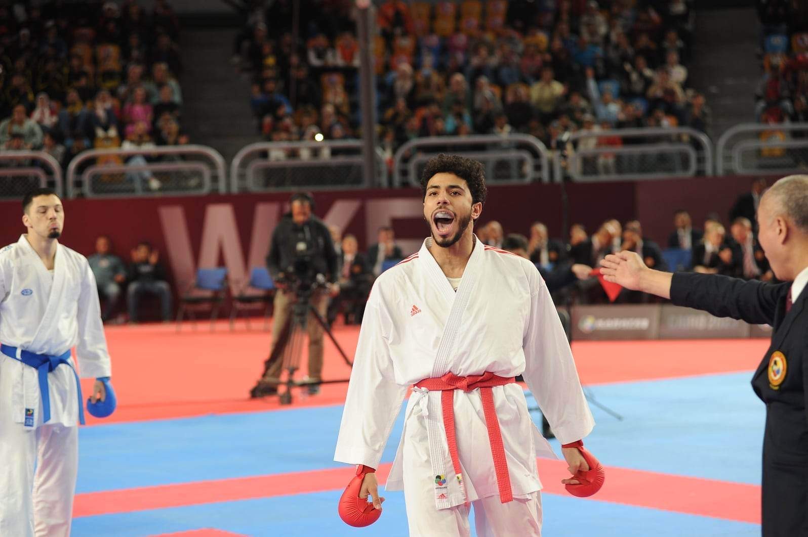 توج عبد الله هشام لاعب منتخب الكاراتيه بذهبية الكوميتيه رجال لوزن -75 كجم بالدوري العالمي للكاراتيه المقام حاليا في استاد القاهرة .