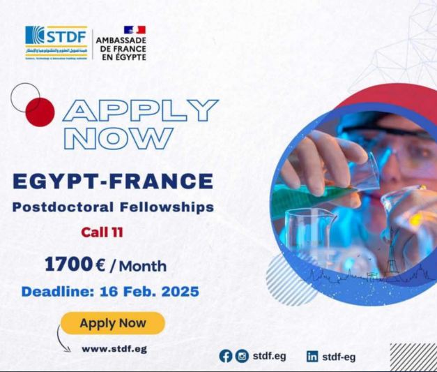 أعلنت هيئة تمويل العلوم والتكنولوجيا والابتكار (STDF) بالتعاون مع السفارة الفرنسية بمصر عن فتح باب التقدم للنداء الحادي عشر من برنامج أبحاث ما بعد الدكتوراه، والذي يهدف إلى تعزيز التعاون بين مصر وفرنسا في مجالات حيوية تشمل الطاقة، الزراعة، الأبحاث الصحية والطبية (لأغراض بحثية فقط)، علوم الأرض والفضاء، الفيزياء، الكيمياء، الأحياء، الرياضيات، الهندسة، الذكاء الاصطناعي، علوم الحاسوب، علوم البيانات، تقنيات الاتصال، التكنولوجيا الحيوية، والنانوتكنولوجي.