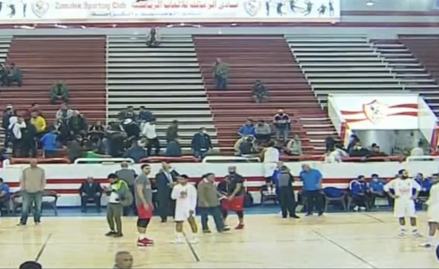 وحتى الآن يحاول المسؤولون عن الصالة إخراج الجماهير من المدرجات لبدء اللقاء او انتظار قرار مراقب المباراة يحيى زكريا.