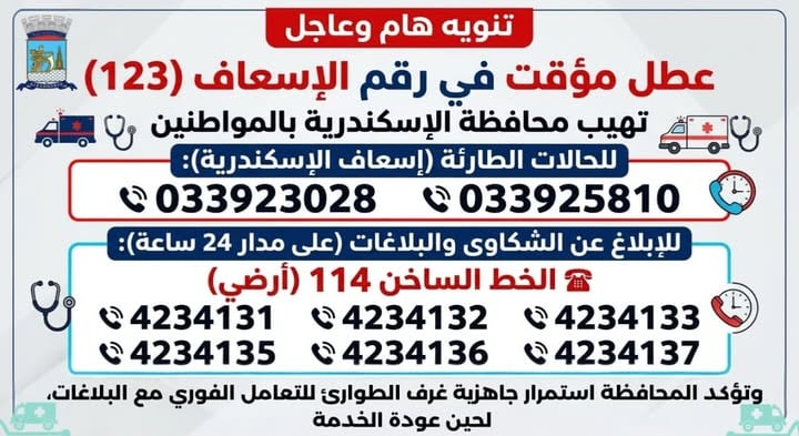 أعلنت محافظة الإسكندرية، اليوم الأحد، حدوث تعطل مؤقت في الاتصال برقم الإسعاف (123)، مؤكدة ضرورة استخدام أرقام بديلة لضمان سرعة الاستجابة للحالات الطارئة داخل نطاق المحافظة.