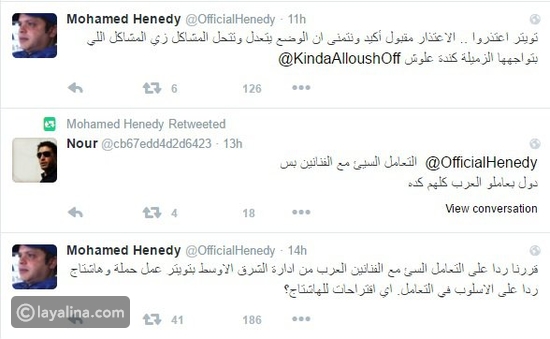 محمد هنيدي كتب بعد فترة من تغريداته السابقة قائلاً: "تويتر اعتذروا .. الاعتذار مقبول أكيد ونتمنى أن الوضع يتعدل وتتحل المشاكل زي المشاكل اللي بتواجهها الزميلة كندة علوش".