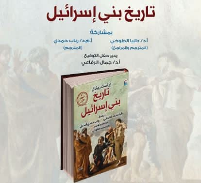 ينظم المركز القومي للترجمة ندوة مناقشة كتاب "تاريخ بني إسرائيل" تأليف إرنست رينان، وذلك يوم الثلاثاء الموافق 5 مايو 2026، في تمام الساعة الخامسة مساءً، بقاعة طه حسين بمقر المركز القومي للترجمة بدار الأوبرا المصرية.