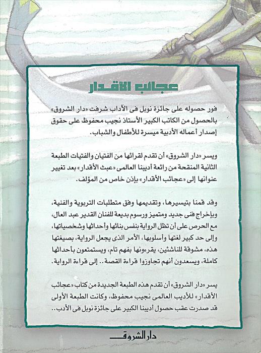 تعتز دار الشروق بمتابعة القراء والنقاد، أولا بأول، لكل ما تنشره وتعرضه، وتحترم كل ما يثار من آراء وملاحظات ونقد وتأخذه بكل الجدية والاهتمام، كما تقدر كل التقدير حرص القراء والنقاد على مكانة وإبداع وعبقرية أستاذنا الكبير نجيب محفوظ، ويسرها أن توضح لهم مرة أخرى مع الاعتذار إن كان فيه تكرار لما أوضحته وأعلنته منذ ثلاث سنوات في بيان سابق بشأن رواية "عبث الأقدار":