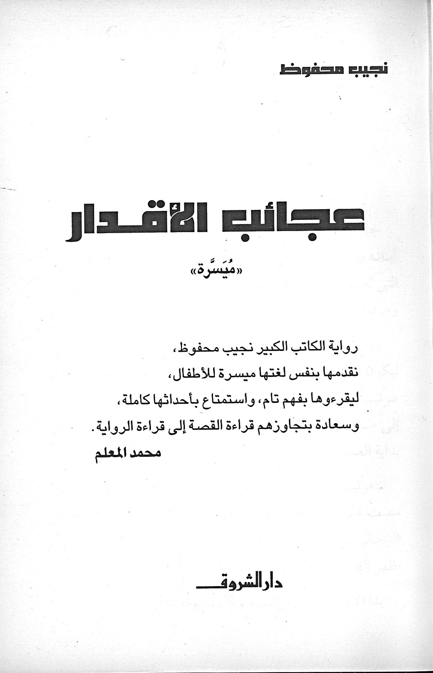 أما الطبعة الميسرة للشباب بعنوان "عجائب الأقدار" التي تصدر منذ عام 1989، بإشراف واختيار واعتماد الأستاذ نجيب محفوظ نفسه، وقد صدرت منها خلال السنوات الثلاثين الماضية عدة طبعات مبسطة وميسرة ومطعمة برسومات تناسب المرحلة العمرية المستهدفة، وكانت أولى هذه الطبعات بريشة الفنان الكبير حلمي التوني، ثم الفنان الكبير مصطفى حسين، ثم الطبعة الحالية بريشة الفنان الكبير عبد العال.