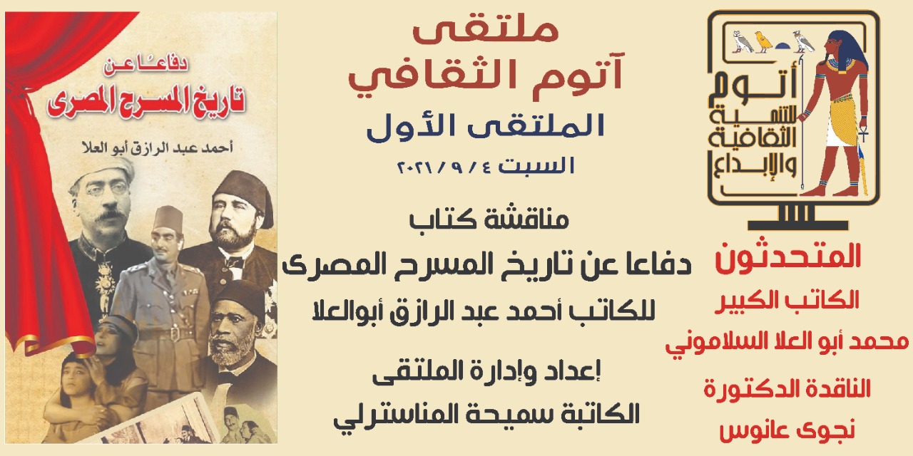 ويناقش الملتقى كتاب "دفاعًا عن تاريخ المسرح المصري"، للكاتب أحمد عبد الرازق أبو العلا، في السابعة من مساء يوم السبت المقبل، في مقر المؤسسة بحي الهرم.
