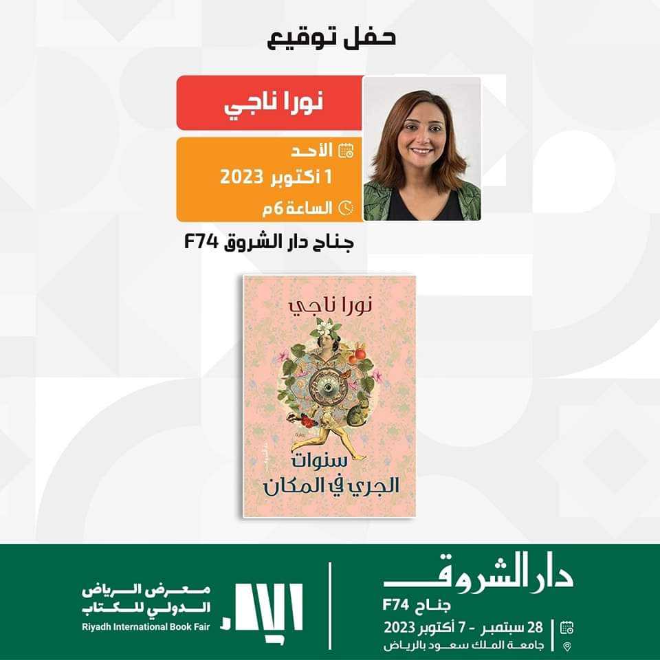 تنظم دار الشروق حفل توقيع رواية "سنوات الجري في المكان" للروائية نورا ناجي، وذلك يوم الأحد المقبل الموافق 1 أكتوبر، في جناح دار الشروق رقم F74 بمعرض الرياض الدولي للكتاب 2023.
