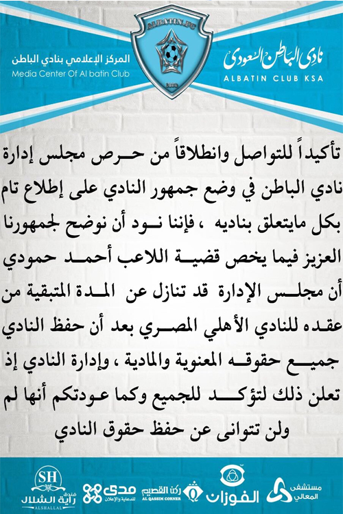 أصدر نادي الباطن السعودي بيانًا رسميًا مساء اليوم الاثنين يعلن فيه عن انتقال لاعبه أحمد حمودي إلى صفوف الأهلي.