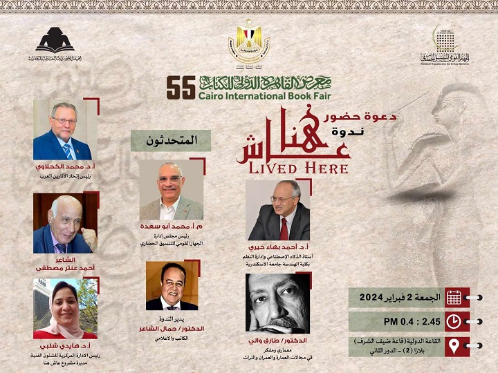 تحت رعاية وزير الثقافة الدكتورة نيفين الكيلاني، يعقد الجهاز القومي للتنسيق الحضاري برئاسة المهندس محمد أبو سعدة، ندوة "عاش هنا" بمعرض القاهرة الدولي للكتاب بالقاعة الدولية قاعة ضيف الشرف بلازا ٢، وذلك من الساعة ٢:٤٥ إلى ٤ مساء الجمعة المقبل ٢ فبراير ٢٠٢٤.