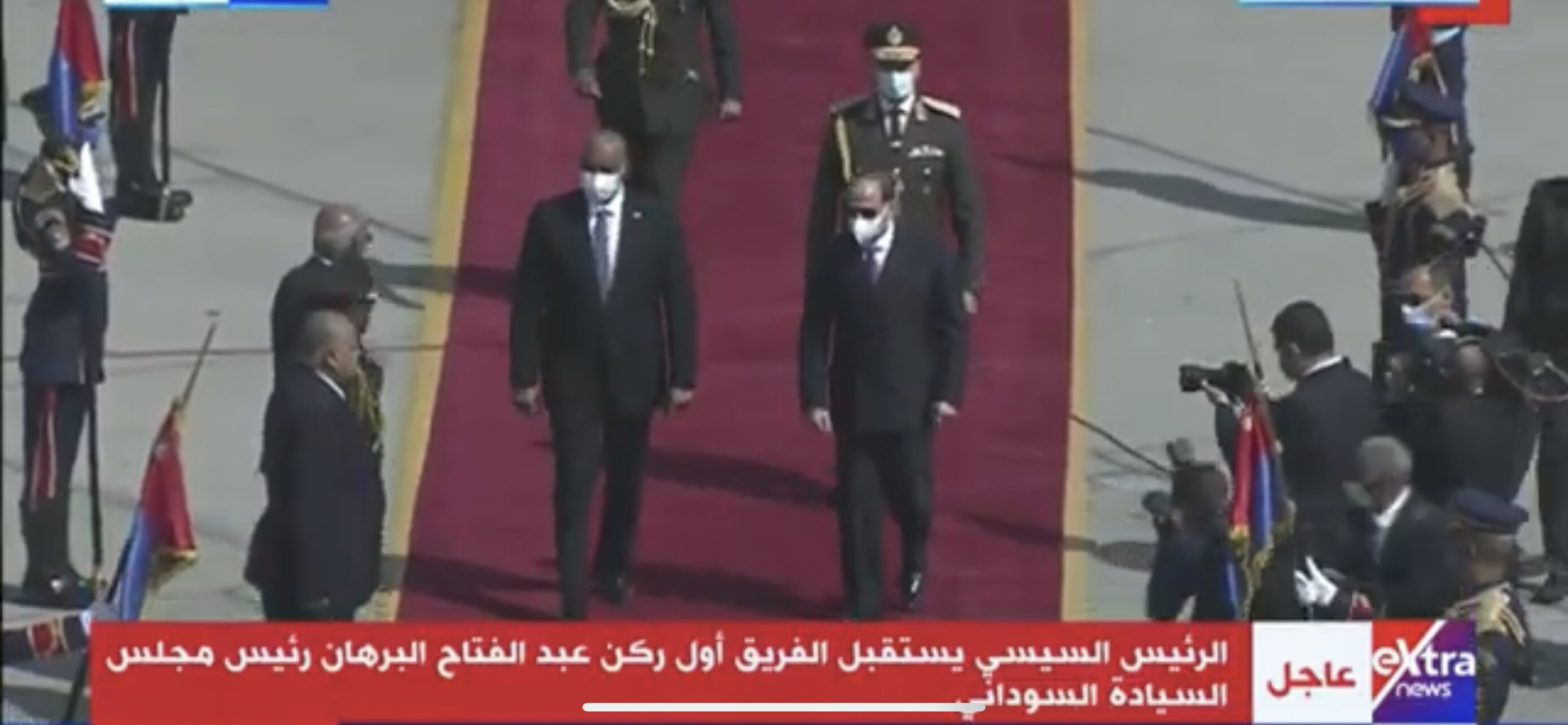 عرضت فضائية «إكسترا نيوز» مقطع فيديو يرصد لحظة وصول رئيس مجلس السيادة الانتقالي السوداني الفريق أول ركن عبدالفتاح البرهان، صباح اليوم الأربعاء، مطار القاهرة الدولي، حيث كان الرئيس عبدالفتاح السيسي في استقباله.