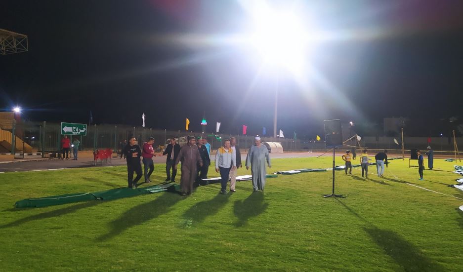 تابع الشيخ السيد يوسف غيط، وكيل وزارة الأوقاف بجنوب سيناء، مساء اليوم الأحد، أعمال تجهيز فرش ساحة صلاة عيد الفطر باستاد طور سيناء الرياضي، استعدادًا لاستقبال المصلين.