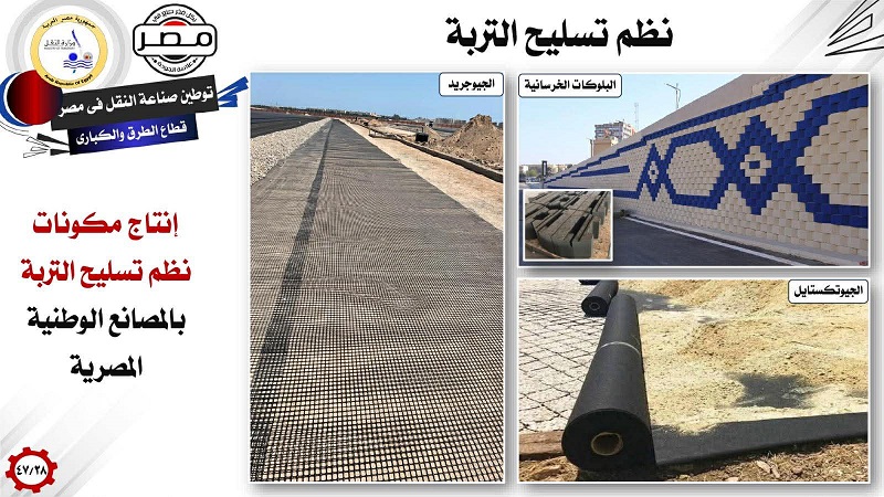 وفي مجال الهندسة الجيوتقنية، يتم إنتاج مكونات نظم تسليح التربة داخل المصانع المصرية، وتشمل البلوكات الخرسانية، الجيوجريد، والجيوتكستايل، منوهة إلى أن هذه الأنظمة تعمل على تثبيت جوانب الطرق، والحوائط الساندة، والمنحدرات الترابية، بما يعزز استدامة مشروعات الطرق والكباري.