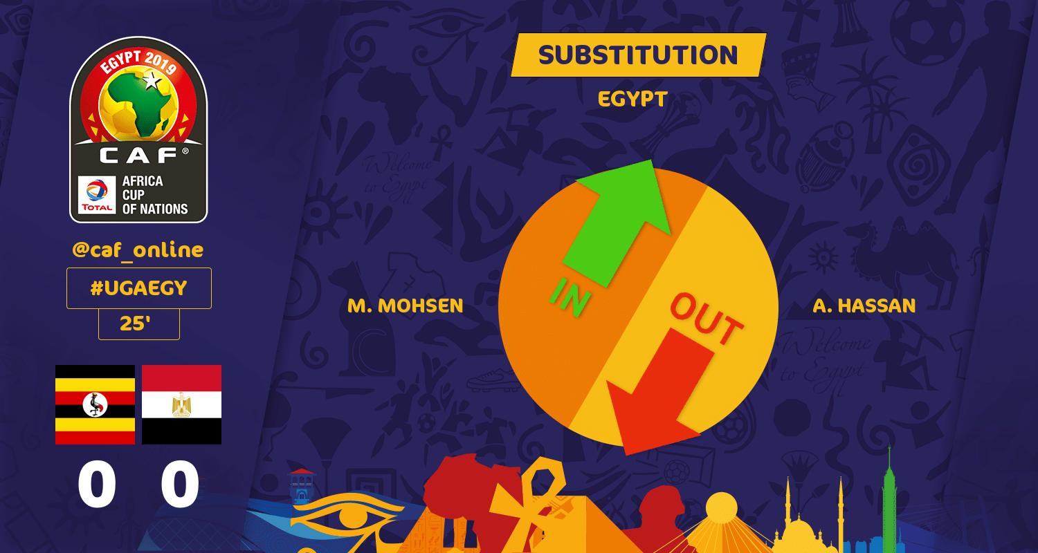- الدقيقة 24 التبديل الأول اضطراريًا لمنتخب مصر بخروج أحمد حسن كوكا ونزول مروان محسن