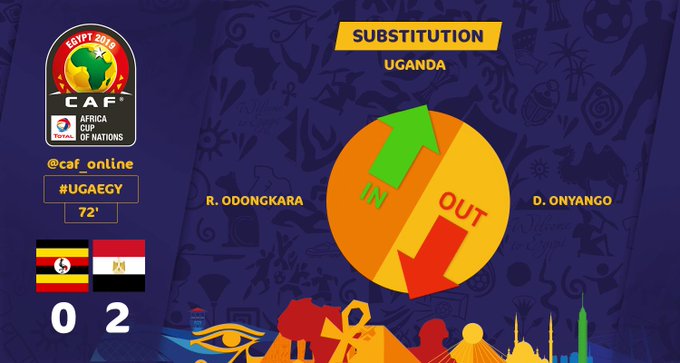 - الدقيقة 72 التبديل الثاني أضطراريًا لمنتخب أوغندا بخروج الحارس دينيس أونيانجو ونزول روبيرت أودنجكارا